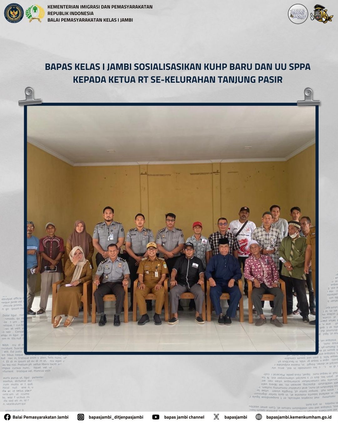 Dalam kegiatan tersebut, Bapas Kelas I Jambi diwakili oleh Kepala Seksi Bimbingan Klien Dewasa (Kasi BKD) Nasrul, didampingi oleh Kepala Sub Seksi Bimbingan Kerja BKD Ade Malneda, serta Pembimbing Kemasyarakatan (PK) Bapas Jambi. Sosialisasi ini diikuti oleh peserta yang terdiri dari Sekretaris Lurah, para Ketua RT se-Kelurahan Tanjung Pasir, perwakilan Lembaga Adat Melayu (LAM), serta masyarakat setempat.