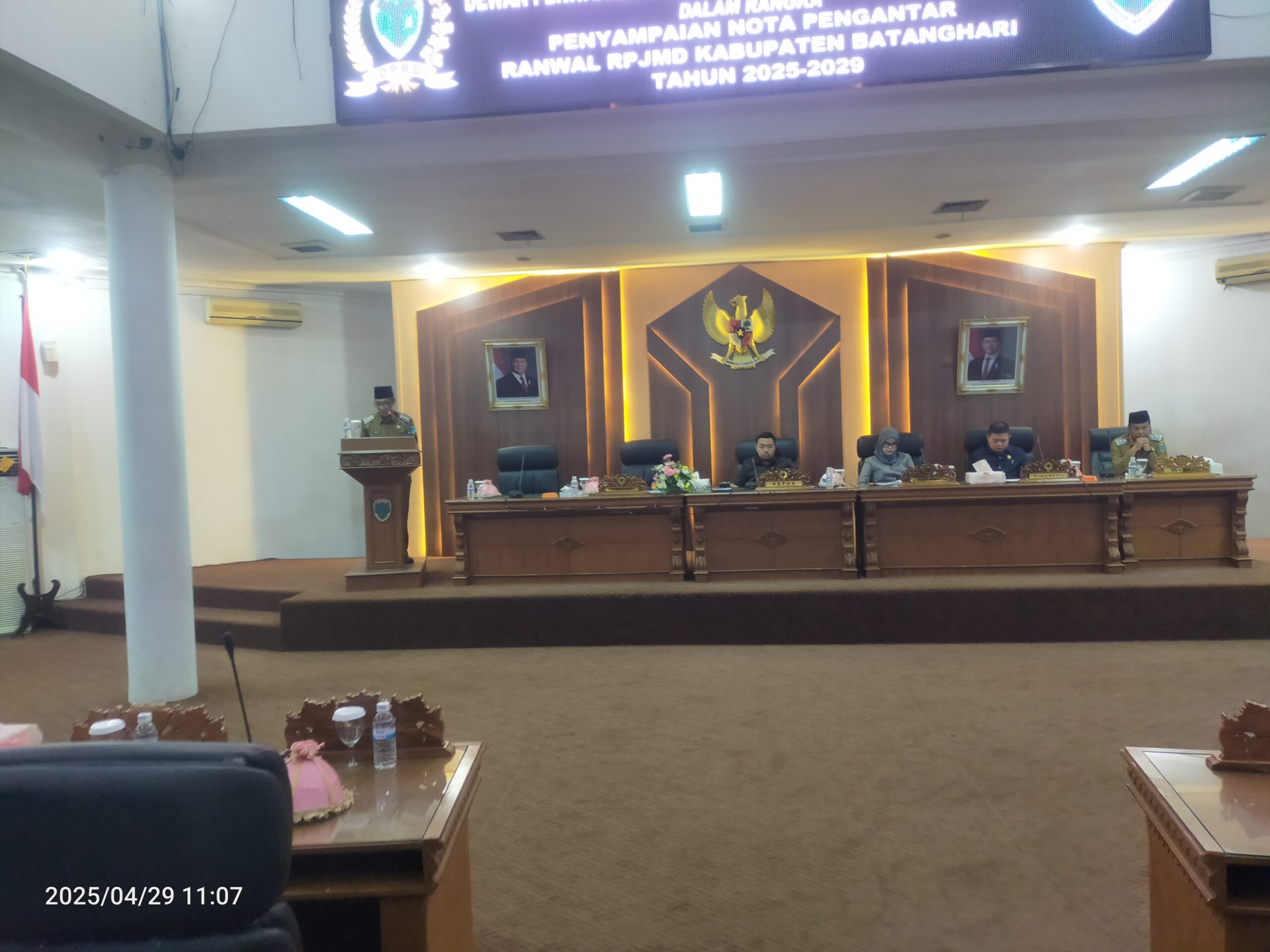 “Agenda Rapat Paripurna DPRD Kabupaten Batanghari pada Hari ini adalah, Penyampaian Nota Pengantar Rancangan Awal Rancangan Pembangunan Jangka Menengah Daerah (RPJMD) Kabupaten Batanghari Tahun 2025-2029,” katanya.