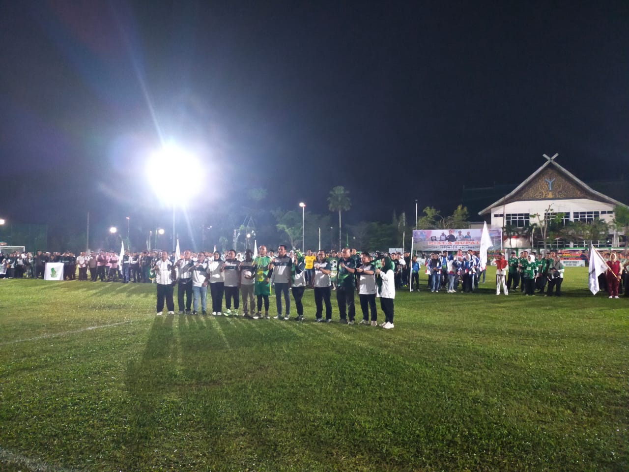 NEWSINFO.ID, BATANG HARI – Bupati Muhammad Fadhil Arief jajaran dan Bupati Hurmin jajaran main Bola Kaki tanding persahabatan Opening Piala Bupati Batang Hari Super Tangguh antar OPD dan Organisasi Vertikal U-35 di Alun-alun Garuda, Sabtu malam (23/08/2025).