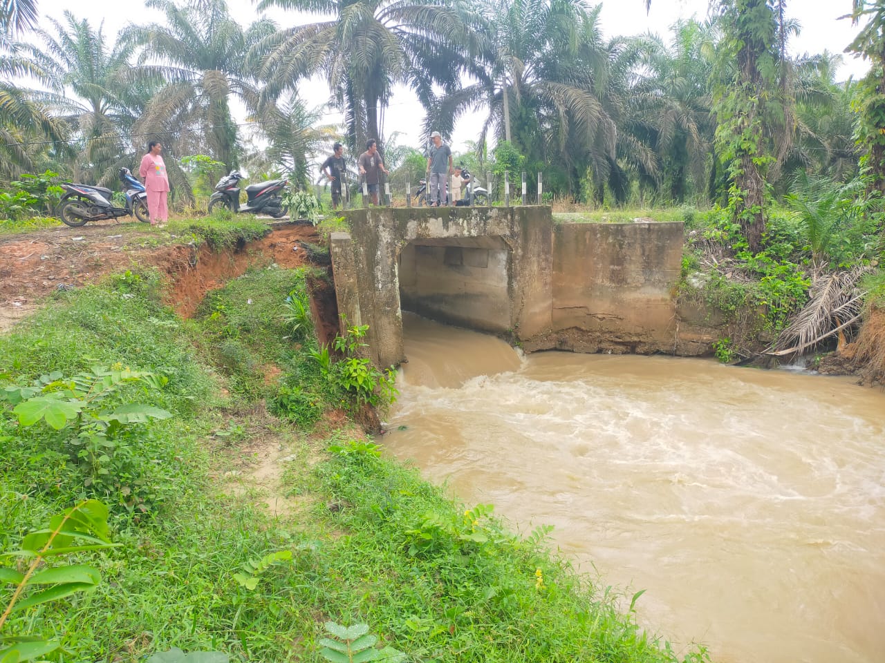 Saat dilokasi Kamis 4 Desember 2025, terlihat beberapa warga memantau jembatan yang telah patah pada sisi bagian belakang dan terlihat tanah yang mulai longsor.