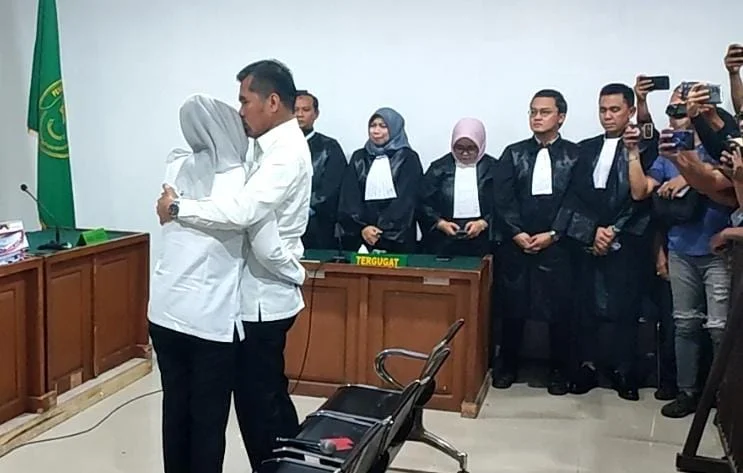 Usai mendengarkan amar putusan, terpidana Fitrianti Agustinda dan terpidana Dedi Siprianto, sambil berpelukan terlihat menangis haru, seolah tidak percaya dengan vonis yang dijatuhkan oleh majelis hakim.