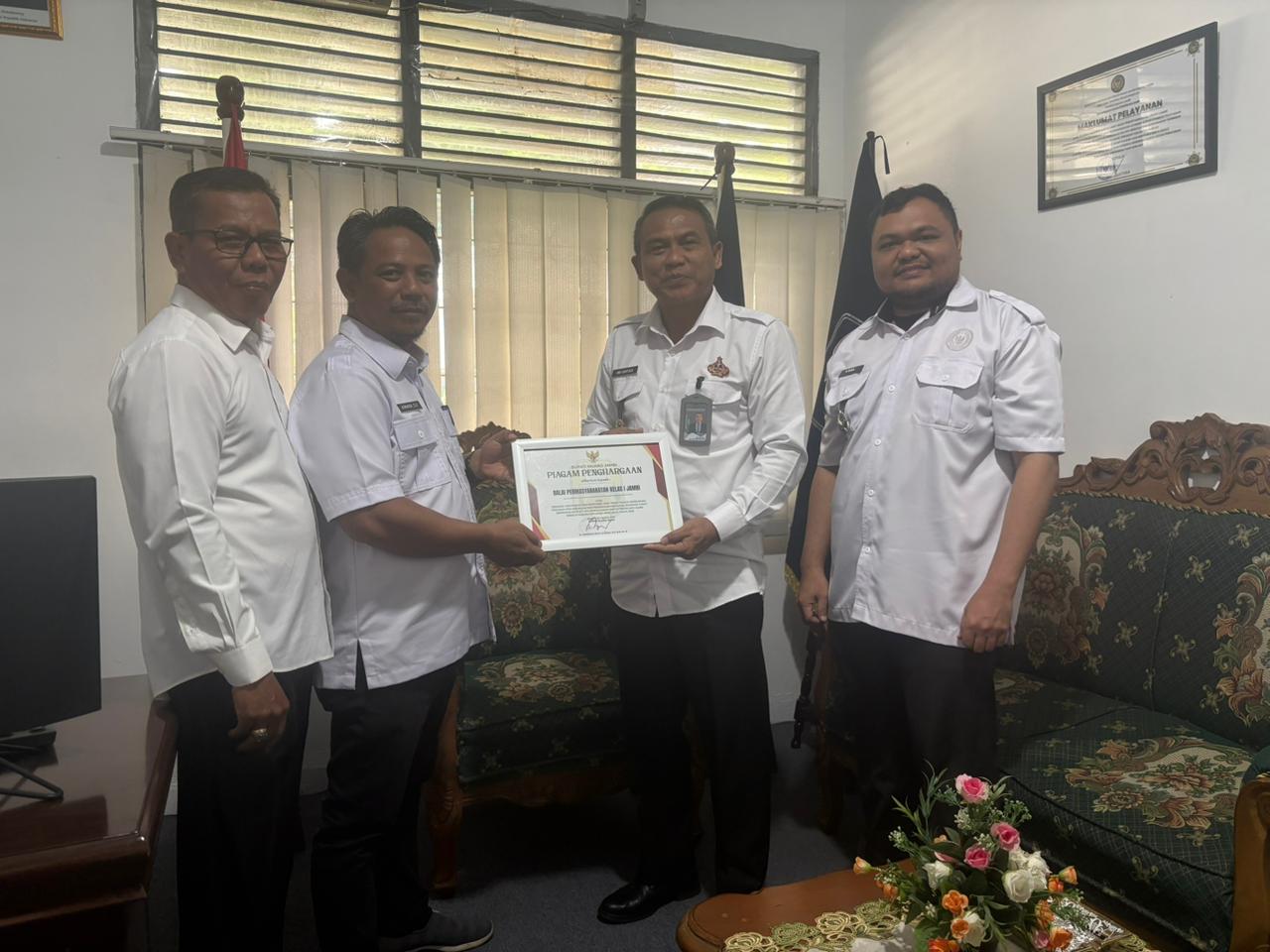 Penyerahan piagam dilakukan secara langsung oleh Kabid Pemberdayaan Perempuan dan Anak Dinas Sosial Muaro Jambi, Junaidi, S.E., yang mewakili Bupati Muaro Jambi, kepada Kepala Bapas Kelas I Jambi, Dwi Santosa, bertempat di Kantor Bapas Kelas I Jambi pada Rabu pagi (5/11/2025).